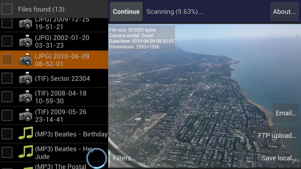 (植根設(shè)備只?。〥iskDigger可以取消刪除和恢復(fù)丟失的照片,文檔,視頻,音樂和更多的從你的記憶卡或內(nèi)存(見下文支持的文件類型)。無論您意外刪除的文件,甚至格式化存儲(chǔ)卡,DiskDigger的強(qiáng)大的數(shù)據(jù)恢復(fù)功能,可以找到你丟失的文件,讓你恢復(fù)它們,并將它們發(fā)送到一個(gè)電子郵件帳戶,或?qū)⑺鼈兩蟼鞯紽TP服務(wù)器。有關(guān)完整說明,請(qǐng)參閱http://diskdigger.org/android