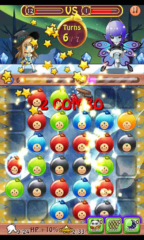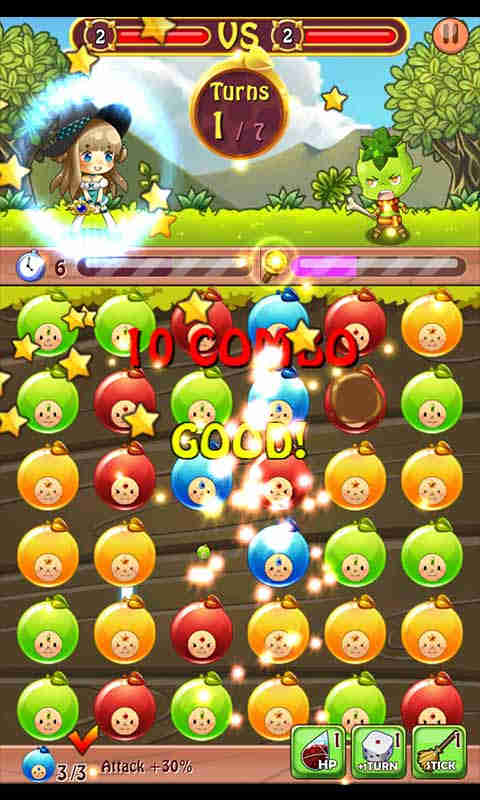 這一關(guān)的泡泡,是從上往下掉的,玩家要根據(jù)提示的顏色去消除掉下落的泡泡。下落的泡泡,可以用連線或點(diǎn)擊的方式消除,順帶一提,連線連的多會有combo數(shù)加成哦,不過連線圖中碰到其他顏色的泡泡將會中斷連線,玩家需要重新連過,而且每錯(cuò)過一個(gè)當(dāng)前提示顏色的泡泡,怪物就會回一部分血,打錯(cuò)泡泡時(shí),怪物也會回一部分血??偟难灾@一類型也還是挺好上手,合理用連線組成高combo,造成高傷害,這就是下落型的玩法了。