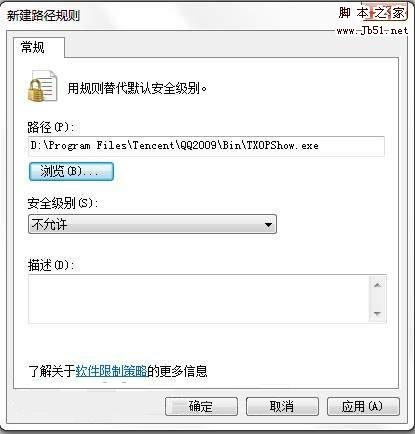 其實(shí)很簡單:開始--運(yùn)行--輸入"gpedit.msc"打開組策略,依次展開計(jì)算機(jī)配置--windows 設(shè)置--安全設(shè)置--軟件限制策略(這里如果沒有設(shè)置過的朋友需要右鍵點(diǎn)一下新建)--其他規(guī)則,在這里點(diǎn)右鍵新建路勁規(guī)則,分別找到安裝QQ的路徑下的TXOPShow.exe,TXPlatform.exe,QQPetAgent.exe這三個(gè)文件,建三個(gè)規(guī)則,不允許運(yùn)行!OK,搞定,重新打開QQ,看一下進(jìn)程,沒了吧!....哈哈....這個(gè)方法大家可以舉一反三,可以限制一些軟件運(yùn)行!