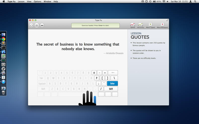 TypeFu mac版是一款蘋(píng)果電腦上用于盲打練習(xí)軟件,初學(xué)英語(yǔ)的人都需要經(jīng)歷打字練習(xí),而這款Type Fu for mac難度循環(huán)漸進(jìn),不同形式的任務(wù)安排合理,非常適合小孩、盲人和初學(xué)者使用。
