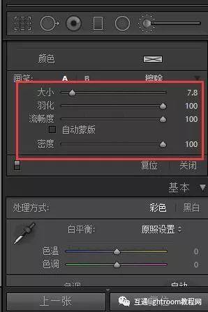 調(diào)整畫筆還具有大小,羽毛,流量和密度的設(shè)置。尺寸和羽毛設(shè)置是為此目的重要的設(shè)置。尺寸設(shè)置將決定用于編輯照片的圓圈的大小。較小尺寸的設(shè)置可以讓您進(jìn)行更精確的編輯,而較大尺寸的設(shè)置會(huì)一次影響更多照片。羽毛決定了刷子邊緣的柔軟度。毛羽為0時(shí),刷子不會(huì)發(fā)生過(guò)渡,而毛羽為100時(shí),毛刷的柔軟邊緣可以達(dá)到平滑過(guò)渡的最大面積。對(duì)于平滑肌膚,我通常會(huì)使用較高數(shù)量的羽毛,比如75.然后,我可以降低需要精細(xì)細(xì)節(jié)和更高精度的區(qū)域。