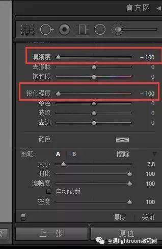 筆刷將應(yīng)用以下設(shè)置:清晰度 - 100,銳化程度-30,雜色+50。