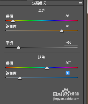 調(diào)色校正,會(huì)用到分離色調(diào),細(xì)節(jié),效果,相機(jī)校準(zhǔn)等,分離色調(diào)是把圖像的高光和陰影分別調(diào)成不同的色調(diào)。參數(shù)如圖。