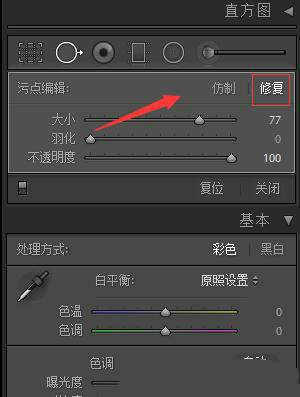 這將打開(kāi)清除工具的設(shè)置。首先要指出的是,你要確保選擇“修復(fù)”,而不是“仿制”。