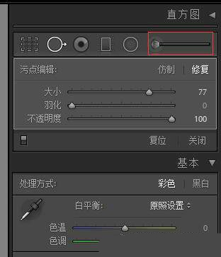 隨著治療的選擇,Lightroom將會(huì)使用一些魔法來(lái)修復(fù)和融合你正在糾正的區(qū)域,從而獲得更平滑,更自然的外觀。下面您會(huì)看到尺寸,羽毛和不透明度的選項(xiàng)。我通常將羽化設(shè)置為0,不透明度設(shè)置為100.尺寸將根據(jù)您正在糾正的區(qū)域大小或缺陷而變化。隨著您增大或減小尺寸設(shè)置,您會(huì)注意到圓圈(如下所示)會(huì)相應(yīng)增加或減少。