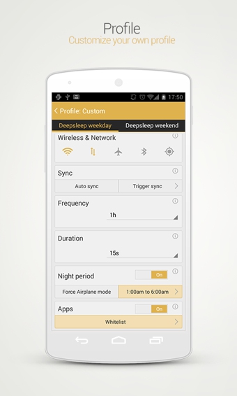 ☆5個預(yù)先定義的設(shè)定檔:溫和,平衡,強大的,積極進取,Slumberer。他們各不相同的頻率,持續(xù)時間和其他設(shè)置。前者是破壞性較小,但節(jié)省電池少,反之亦然☆自定義配置文件(PRO) - 適用于高級用戶。如果您需要更多的自定義,選擇此配置文件并修改它