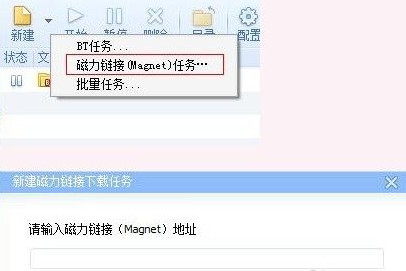 2、如果你的迅雷沒有開啟,只能打開迅雷,點擊新建按鈕旁的“箭頭”,選擇“磁力鏈接任務(wù)”把復(fù)制的“磁力鏈接”填入彈出的輸入框內(nèi),點擊“立即下載”即可。