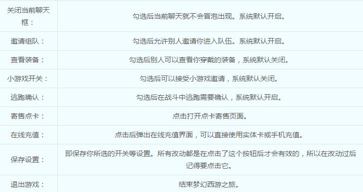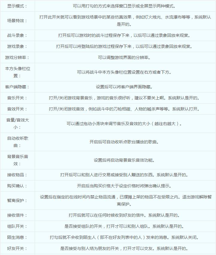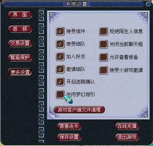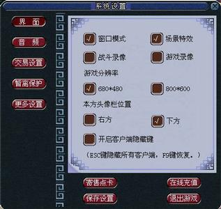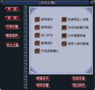 游戲中可以通過系統(tǒng)設(shè)置來調(diào)整畫面、聲音方面的一些屬性和某些狀態(tài)的設(shè)定。其主要功能包括顯示模式選擇、場(chǎng)景特效開關(guān)、音樂開關(guān)、音效開關(guān)、音量大小調(diào)節(jié)、拒絕陌生人消息開關(guān)、信件接收開關(guān)、直接接受物品開關(guān)、組隊(duì)開關(guān)、好友開關(guān)、保存設(shè)置、玩家手冊(cè)和退出游戲。