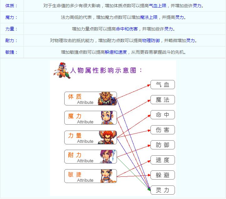游戲中人物的天賦屬性有五個(gè),包括體質(zhì)、魔力、力量、耐力和敏捷,天賦屬性的變化影響著角色在各方面的能力強(qiáng)弱,例如敏捷屬性影響戰(zhàn)斗時(shí)的出手順序,而體質(zhì)較強(qiáng)者的生命值往往比較高。人物屬性的初始值由系統(tǒng)賦予,不同種族的角色,初始的屬性也不同。