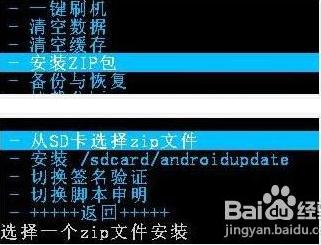 執(zhí)行“安裝zip包”-從sd卡選擇zip文件(某些自帶存儲機型為內(nèi)部存儲選擇zip文件)-選中,確認;