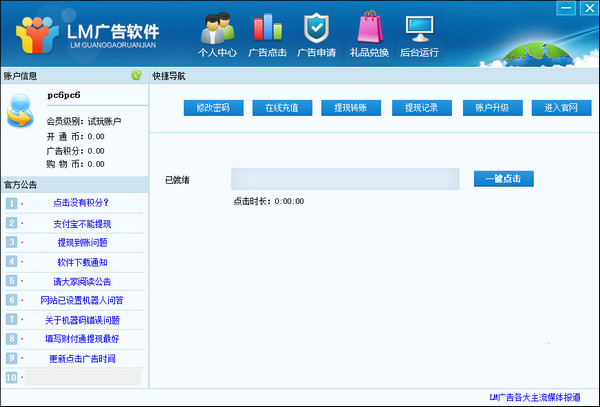 LM廣告軟件是目前網(wǎng)上擁有的唯一一個采用軟件來點(diǎn)擊廣告的軟件,經(jīng)過長時間的努力,自主開發(fā)的《LM廣告全自動軟件》,現(xiàn)在正處于行業(yè)的領(lǐng)先水平。