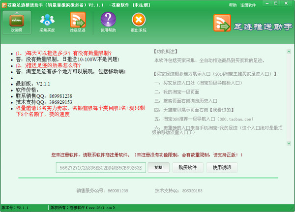 蒼狼足跡推送助手是一款淘寶網(wǎng)店的推廣軟件,這款軟件的功能也非常的實(shí)用,集淘寶買家采集,淘寶買家足跡推送功能為一體,可以把您的寶貝推送給到任意陌生買家我的足跡!