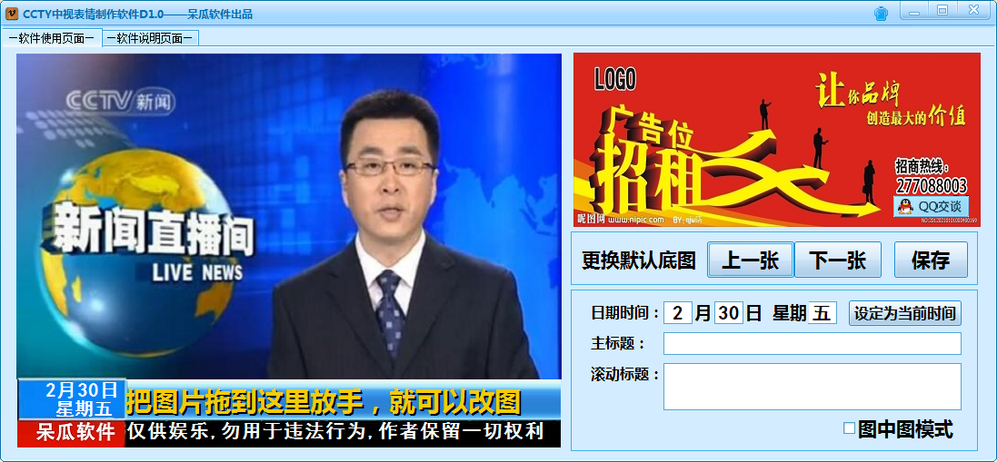 新聞圖片制作軟件是一款可以制作搞笑新聞圖片的小工具,它有眾多cctv央視新聞圖片素材,我們只要填入想要出線在主標題和滾動標題里的內(nèi)容,就可以一鍵生成,用來惡搞或當qq表情用什么的太棒了!