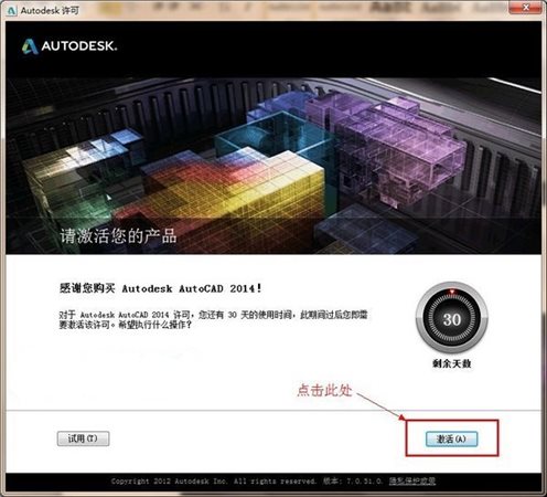 2、安裝完成后,最為緊要的便是破解激活了,啟動你電腦上的CAD2014軟件,在安裝時沒有注冊的情況下,點激活。