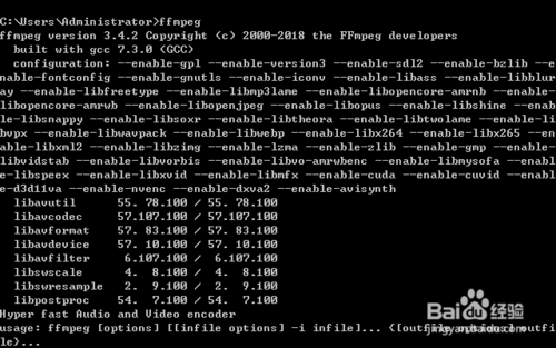 7.最后進入cmd這里,輸入ffmpeg,看到一排的提示,不是提示不是內(nèi)部或者外部命令即為成功了。