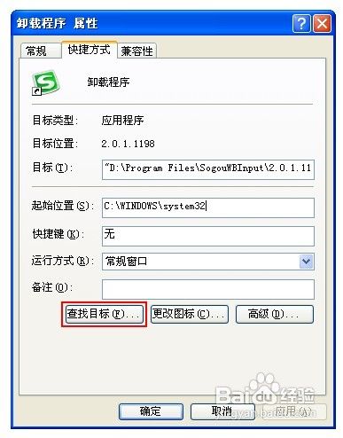 定位到搜狗輸入法安裝目錄中。具體方法:在搜狗輸入法卸載程序上右擊,選擇“屬性”,在打開的對話框中點擊“查找目標(biāo)…”即可找到搜狗輸入法的安裝目錄。