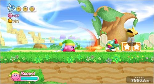 -劍客:卡比系列經(jīng)典的能力,吸收敵人后變身帶著綠帽子(林克?)揮舞利劍的劍客。