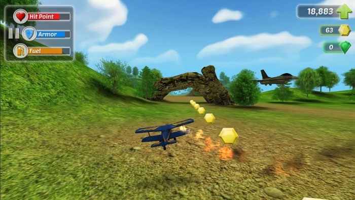 游戲的玩法與其說(shuō)是”創(chuàng)新”,還不如說(shuō)是換湯不換藥,但凡玩過(guò)天天酷跑的玩家在接觸這款游戲時(shí)都曉得這個(gè)游戲的大致玩法。玩家可以通過(guò)觸屏或者重力感應(yīng)控制飛機(jī)的起降高低,只要不要撞到石頭上或者迎面而來(lái)的敵機(jī)即可,而游戲中的金幣、道具用法其實(shí)也和酷跑里的差不多。例如燃燒之翼里的U型磁鐵,沖刺道具等。但這款游戲玩法也并非毫無(wú)亮點(diǎn)可言,比如新增其他新道具,比如飛機(jī)的燃料(因?yàn)轱w行是需要消耗燃料的,所以玩家需要及時(shí)補(bǔ)充才行)、修理飛機(jī)等,另外,飛機(jī)即使狠狠撞上石頭,也不會(huì)馬上失事,而是機(jī)翼燃燒著,只要玩家不再撞到障礙物,就可以這樣無(wú)盡地燃燒下去!