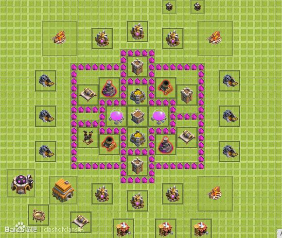 5、 搶錢已經(jīng)漸漸地找到了自己的思路與理解,自己喜歡的兵種搭配也已經(jīng)建立,4本滿建筑,你升級(jí)到五本了。依舊首先推薦一個(gè)5本防守陣型。
