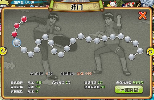 升級(jí)到11級(jí)完成主線后,開啟了八門系統(tǒng),八門系統(tǒng)是利用查克拉開啟的,開啟的八門越多,那么自己屬性戰(zhàn)斗力就會(huì)提高的越多。