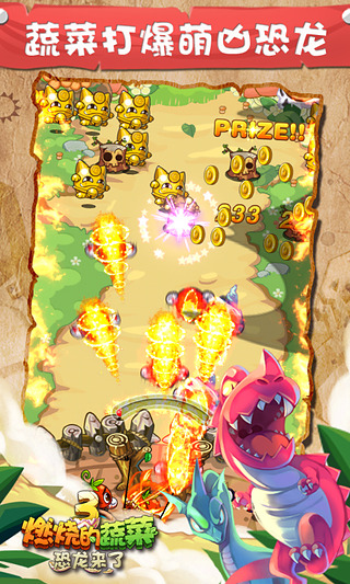 燃燒的蔬菜3游戲畫面依舊延續(xù)前作的卡通賣萌畫風(fēng),但不難看出,一部更比一部強的在不斷改進。在色彩更加艷麗且飽滿的畫面中,無論是主角小蔬菜還是小怪獸的Q版設(shè)計,都被最大程度的萌化了。燃燒的蔬菜3繼承了前作的經(jīng)典游戲模式和游戲背景,進一步豐富了蔬菜的種類一級怪物類型,與此同時還增加了多種新要素供玩家發(fā)掘,可玩性和趣味性都得到極大提升。燃燒的蔬菜3全新引擎帶來絢麗畫質(zhì),蔬菜家族對決萌兇恐龍,前所未見的彈射塔防新玩法,蔬菜農(nóng)場缺啥種啥,F(xiàn)ever燃燒模式爽快爆棚。這個夏天最萌爆游戲,加入蔬菜3戰(zhàn)隊,讓我們一起打怪獸吧!
