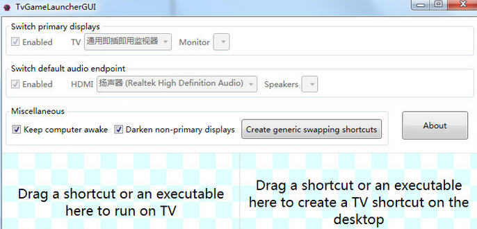 要用電視玩游戲,首先得要有 HDMI 線將電視與電腦連接起來,之后只需將游戲.exe 拖進(jìn) TvGameLauncher 窗口,就能創(chuàng)建一個(gè)新的快捷方式,以后要啟動(dòng)游戲就用這個(gè)新的快捷方式。運(yùn)行后會(huì)自動(dòng)將電視設(shè)置為主顯示器,并啟用電視喇叭作為音頻播放設(shè)備,還會(huì)讓其他顯示器變暗,并防止睡眠、休眠、屏幕保護(hù)程序