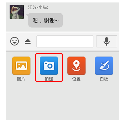 2、在對(duì)話框中點(diǎn)擊輸入框左側(cè)的“+”,選擇“拍 照”。需要說(shuō)明的是,在此前的版本中,這一步 應(yīng)該是點(diǎn)擊“圖片”的。但在最新的手機(jī)QQ201 3(4.2.0版以上)必須點(diǎn)擊拍照才能實(shí)現(xiàn)。如圖: