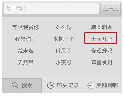 1、選擇任意關(guān)鍵字或者在輸入框里面輸入想要的文 字,比如“你幸福嗎”,下面舉例為:點(diǎn)擊選擇”天 天開心“。