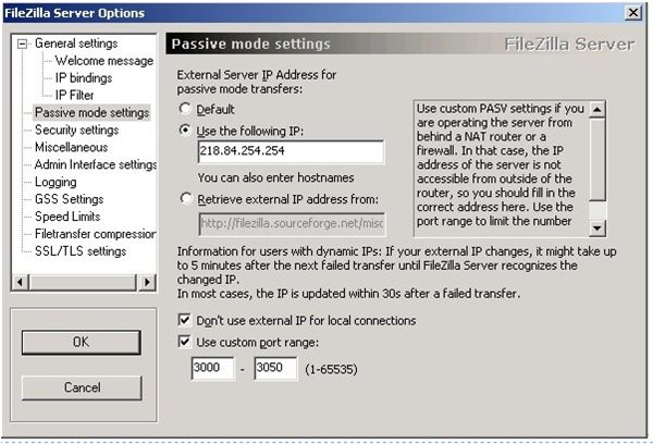 對于在局域網(wǎng)中的服務(wù)器,如果服務(wù)器沒有置于DMZ區(qū),那么強(qiáng)烈建議選中下面的“Use custom port range”定義PASV端口范圍。由于PASV模式中,是服務(wù)器隨機(jī)打開端口,然后把打開的端口號告訴客戶端,讓客戶端連接打開的端口。但是因?yàn)榉?wù)器處于網(wǎng)關(guān)后面,如果網(wǎng)關(guān)那里沒有做對應(yīng)的端口映射,客戶端從外網(wǎng)就無法連接服務(wù)器打開的端口,導(dǎo)致PASV模式連接失敗。在這里限定服務(wù)器打開的端口范圍,然后到連接外網(wǎng)的網(wǎng)關(guān)那里,對服務(wù)器的這些端口做端口映射(虛擬服務(wù))。這需要服務(wù)器和Internet網(wǎng)關(guān)設(shè)備配合設(shè)置,這樣外網(wǎng)的客戶端才能用PASV模式連接進(jìn)來。