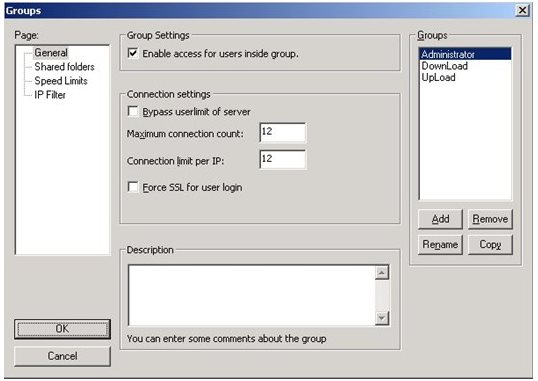 組設(shè)置中的“Speed Limits”和“IP Filter”跟全局設(shè)置里面的速度限制和IP過濾器設(shè)置方法是一樣的,請參照前面的內(nèi)容。只不過這個(gè)是僅僅針對這個(gè)組的用戶生效。而全局設(shè)置是對所有的用戶都生效。設(shè)置完畢之后點(diǎn)擊“OK”按鈕回到主界面。