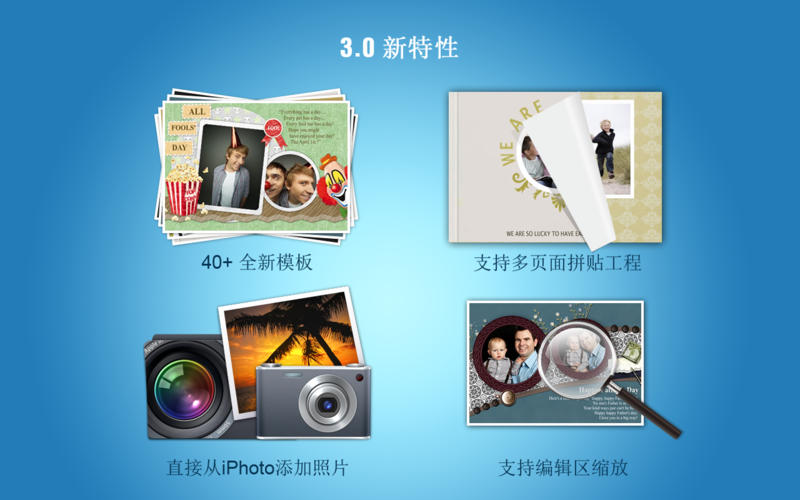 拼貼大師3免費(fèi)版擁有40+模板和數(shù)百藝術(shù)資源,豐富的拼貼元素、廣泛的拼貼裝飾選擇,是Mac OS X系統(tǒng)下一款功能強(qiáng)大且使用簡(jiǎn)單的照片拼貼制作工具, 它可以讓您快速制作照片拼貼, 剪貼簿, 賀卡, 照片日歷, 相冊(cè), 海報(bào)等.讓您將生活中的美好瞬間變成精美的照片拼貼和親朋好友分享.