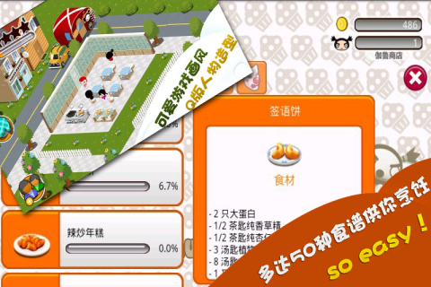 【可愛(ài)游戲畫風(fēng),Q版人物造型】 可愛(ài)游戲畫風(fēng),Q版人物造型,游戲音樂(lè)節(jié)奏完美,是烹飪fans和時(shí)尚潮人必備游戲。同時(shí),游戲內(nèi)從料理,收集,任務(wù)等等應(yīng)有盡有,各種挑戰(zhàn)等你完成。在世界著名餐廳的排行榜里注冊(cè)你的餐廳,向著世界排名第一餐廳的邁進(jìn)吧!【多達(dá)50種食譜供你烹飪】 作為一款經(jīng)營(yíng)類烹飪游戲《中國(guó)娃娃餐廳》涵蓋多達(dá)50種不同的料理食譜,供你烹飪。從可口的開(kāi)胃菜到垂涎三尺的正餐,以及精美的甜點(diǎn),此外網(wǎng)羅各國(guó)多樣化的小吃。你還等什么?拿起食譜開(kāi)始烹飪美味吧!