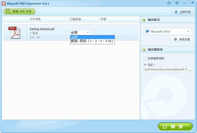 1、iSkysoft PDF Converter 轉檔軟體的使用方法很簡單,按下左上角新增 PDF 文件,或是直接把文件拖曳到視窗裡,選擇要轉檔的頁面。