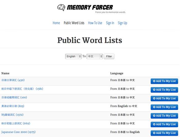 其實我們在使用Memory Forcer 前需要在Web 端做許多準備,首先,需要在MF的官網(wǎng)上注冊賬號,然后可以到Public Word List逛逛,找找適合自己的單詞表添加以下,開始學(xué)習(xí):