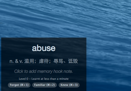 Memory Forcer 是一款外語自學(xué)強化軟件,主攻單詞領(lǐng)域,啟用后能每過一段時間向桌面推送一條單詞,并伴有中文釋義和人聲朗讀,用戶還可以添加注釋,并選擇目前對這個單詞的記憶程度(Forgot,F(xiàn)amilar,Knew三個級別)。