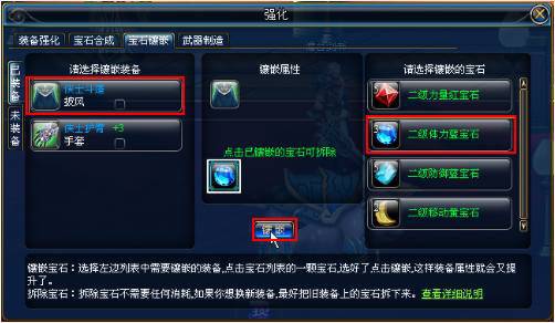 第四步,左鍵點(diǎn)擊界面右側(cè)“需要鑲嵌的寶石”,將寶石放入裝備的插槽中,最后點(diǎn)擊“鑲嵌”按鈕完成操作。