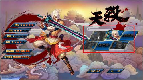第一次進(jìn)游戲選擇服務(wù)器進(jìn)入游戲,等待游戲加載完成,進(jìn)入創(chuàng)建角色界面。創(chuàng)建角色界面初始顯示的職業(yè)是“天殺”,界面左側(cè)是天殺職業(yè)的資料,包括職業(yè)特點(diǎn)和人物形象兩部分,右側(cè)紅框標(biāo)注的區(qū)域是各職業(yè)的頭像,點(diǎn)擊頭像可以切換職業(yè)資料。