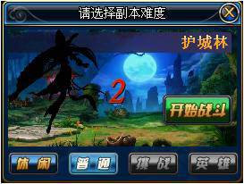 進(jìn)入游戲后您接觸到的第一個(gè)副本是“護(hù)城林”人物自動(dòng)尋路至護(hù)城林后,界面中會(huì)出現(xiàn)一個(gè)副本難度窗口,您可以點(diǎn)擊不同的難度按鈕進(jìn)行選擇。默認(rèn)難度為“普通”,倒計(jì)時(shí)3秒或點(diǎn)擊“開(kāi)始戰(zhàn)斗”圖標(biāo)進(jìn)入副本。
