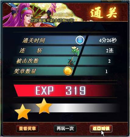 戰(zhàn)勝妖王通關(guān)副本,此時(shí)會(huì)出現(xiàn)一個(gè)通關(guān)獎(jiǎng)勵(lì)窗口,上面詳盡列出此次通關(guān)時(shí)間、連擊次數(shù)、被擊次數(shù),通關(guān)經(jīng)驗(yàn)獎(jiǎng)勵(lì)等,點(diǎn)擊“返回城鎮(zhèn)”離開(kāi)副本(不做操作40秒后自動(dòng)退出副本)。