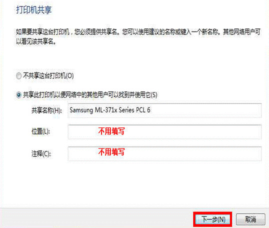 打印機共享(可以根據(jù)您的需要進行選擇),其他地方不用填寫,按照默認的點擊“下一步”即可