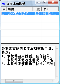 多文本剪貼板下載 V2.0 綠色免費版 多文本剪貼板,最非常方便的多文本剪貼版工具,支持快捷鍵自動粘貼,支持托拽,自動保存記錄。