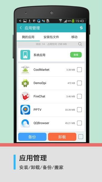 2、應用管理:管理手機應用,還手機一個干凈整潔的世界。