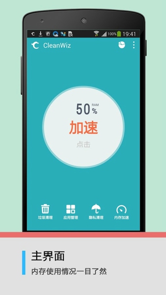 CleanWiz是目前安卓市場上最為簡潔強大的一款清理工具,只有4.3M大小,完全免費,無需任何用戶隱私權限,致力于解決手機運行緩慢、存儲空間不足及個人隱私管理的問題。CleanWiz主要有四大功能——內存加速、應用管理、垃圾清理、隱私清理。