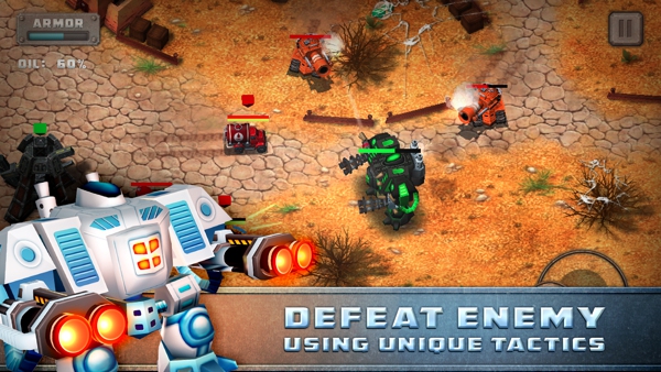 大多數(shù)平板動作游戲的操作都是運用虛擬搖桿來讓玩家體驗游戲。本作也不例外,標(biāo)準(zhǔn)的左鍵移動右鍵射擊讓玩家們不必?fù)?dān)心看不懂英文而不會操作游戲。游戲中還增設(shè)了道具欄位,玩家可以在游戲中購買道具并點擊使用,十分方便。相比之下一款名為《M2神甲戰(zhàn)紀(jì)》的機甲游戲在操作上就比較復(fù)雜,除了不同攻擊外,還加入了技能系統(tǒng)。不得不說,在對比中本作雖然簡單但是內(nèi)容就有些單調(diào)了。