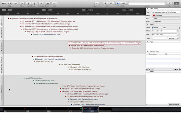大多數(shù)傳統(tǒng)的時(shí)間軸應(yīng)用程序的設(shè)計(jì),以滿足一個(gè)需求:創(chuàng)造一個(gè)有吸引力的一維時(shí)間顯示。他們是表象的,靜態(tài)的,完全適合投影幻燈片和投影儀。Aeon Timeline for mac的目標(biāo)是不同的。人與事之間的模型關(guān)系。將你的事件轉(zhuǎn)換為并發(fā)弧。篩選以人為本,地點(diǎn)和標(biāo)簽事件。放大,查看您所希望看到的時(shí)間尺度。你可以用一個(gè)簡(jiǎn)單的,直觀的界面瀏覽和編輯你的時(shí)間表。當(dāng)你完成后,可將數(shù)據(jù)導(dǎo)出到外部,它還允許你創(chuàng)建自己的幻想日歷系統(tǒng)。而當(dāng)你完成后,將數(shù)據(jù)導(dǎo)出到多種外部格式。