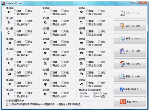 Hide My Drives 能隱藏和保護(hù)任何windows下的驅(qū)動(dòng)器,包括USB、網(wǎng)絡(luò)、軟驅(qū)、CD、DVD、本地磁盤等,可使用密碼保護(hù)。軟件還可禁用自動(dòng)運(yùn)行功能