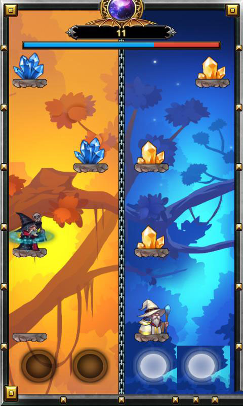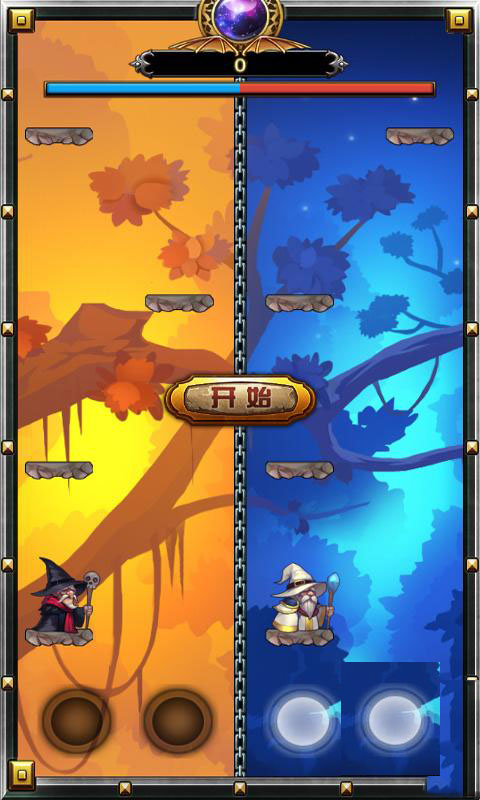 游戲到底怎么玩?畫面中我們只看見四個圈圈。黑白各兩個,到底怎么操控?也沒有新手教程,經(jīng)西瓜一番研究之后發(fā)現(xiàn),原來這四個圓圈分別是用來操控黑白魔法師向上跳躍的,敏捷根據(jù)不規(guī)律的石階左右移動跳躍而上,收集寶石即可。