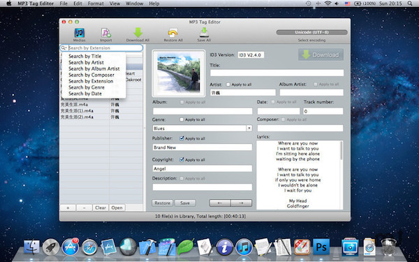 1、支持ID3v1,ID3v2標簽,xiphcomments,猿,OGG標簽,iTunes標簽。標簽:標題,藝術(shù)家,專輯,體裁,版權(quán),評論,作品,歌詞等…你保存文件的歌詞可以正確顯示在你的iPhone或iPod音樂播放器。2、大量的音樂文件支持批處理,支持iTunes進口。