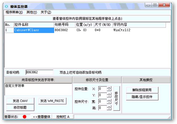 窗體監(jiān)控器 V1.400 簡體中文綠色免費版 編程或調(diào)試工具,用于對第三方程序窗體上各種控件的參數(shù)進行查看和控制。典型應(yīng)用如:查看秘密輸入框中的實際字符內(nèi)容,把被程序禁止點擊的按鈕(灰色按鈕)的禁止解除,把不可以改變大小的窗體和控件改變其大小,以便于顯示出被遮擋的內(nèi)容等