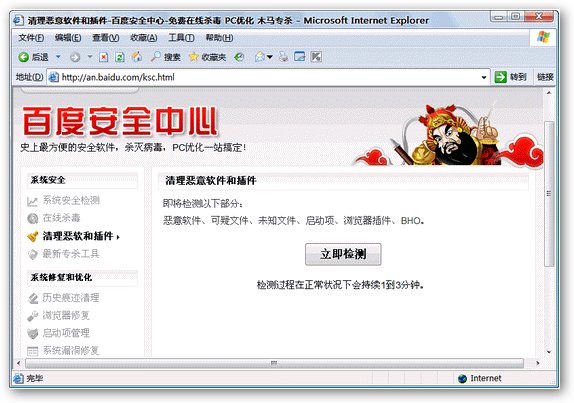 百度安全中心提供了豐富的功能,包括:清理惡意軟件及插件、清理歷史痕跡、瀏覽器修復(fù)、啟動項(xiàng)管理、系統(tǒng)漏洞修復(fù)、網(wǎng)頁防掛馬、U盤病毒免疫等,最值得驚喜的,是在線查毒和 殺毒,都將成為免費(fèi)的午餐。